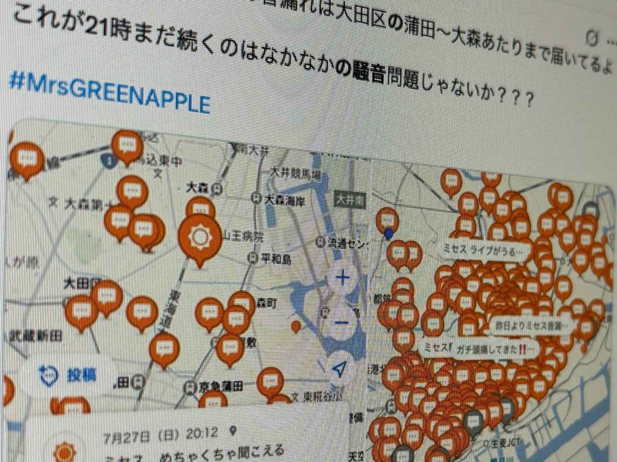 Mrs.GREEN APPLEの野外ライブでの騒音問題がSNSで拡散。周辺住民からの苦情が相次ぎ、トレンド入り。「重低音が聞こえる」「うるさい」とのコメントが多数。問題を可視化した機能も話題に。