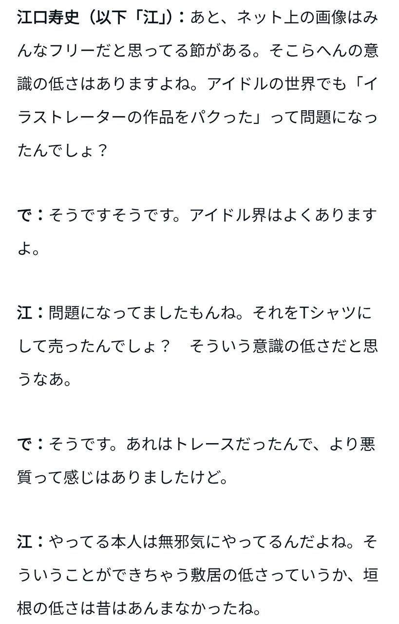 江口「アイドル業界はトレパクをTシャツにして売るとか意識低スギィ」