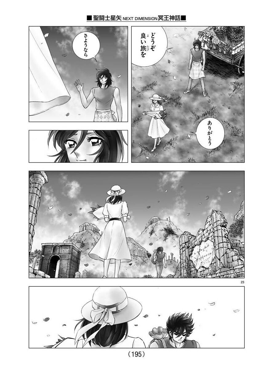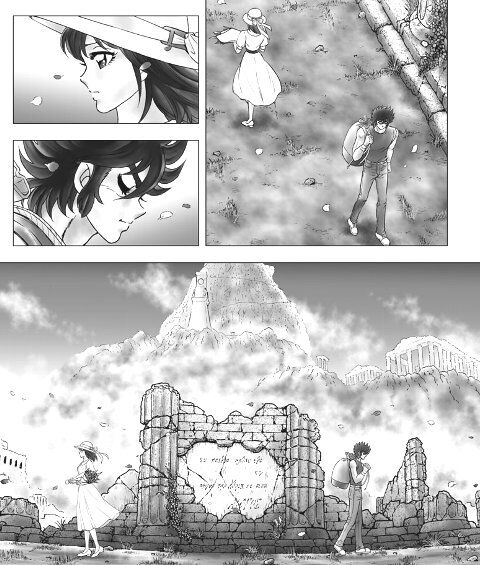 2人はギリシャの街で偶然再会するが、お互いを思い出せないまますれ違っていく。『NEXT DIMENSION』はここで完結を迎え、星矢と沙織の関係は“再会したのに気づかずすれ違う”という切ない形で区切りをつけた。